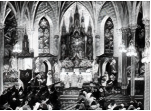 The environment of the Church building facilitates the rituals that take place there and these rituals are perfectly set to practice bridging the dream world to the waking world in reverse of what was previously discussed. When one participates in the holy mass, especially the Liturgy of the Eucharist, many elements of the dream world are in play. In this ritual causality is less important, there is a highly symbolic communication system that is not dependent on locational utterances. Also in this environment abstracts, archetypes, and invisible beings become physically manifest, and language itself is particularly sculpted to invoke sentiment more than illicit reasonable understanding.